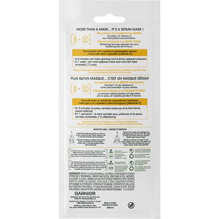 Garnier Green Labs Pinea-C Brightening Serum Sheet Mask has the power of a brightening serum and intense moisture all in a sheet mask. This potent serum mask with Vitamin C and Pineapple extract works to improve dull and tired skin to hydrate and improve glow. In 5 minutes, skin looks glowing and dullness appears reduced. In 1 week* (*3 uses), skin tone appears more even and skin feels renewed.