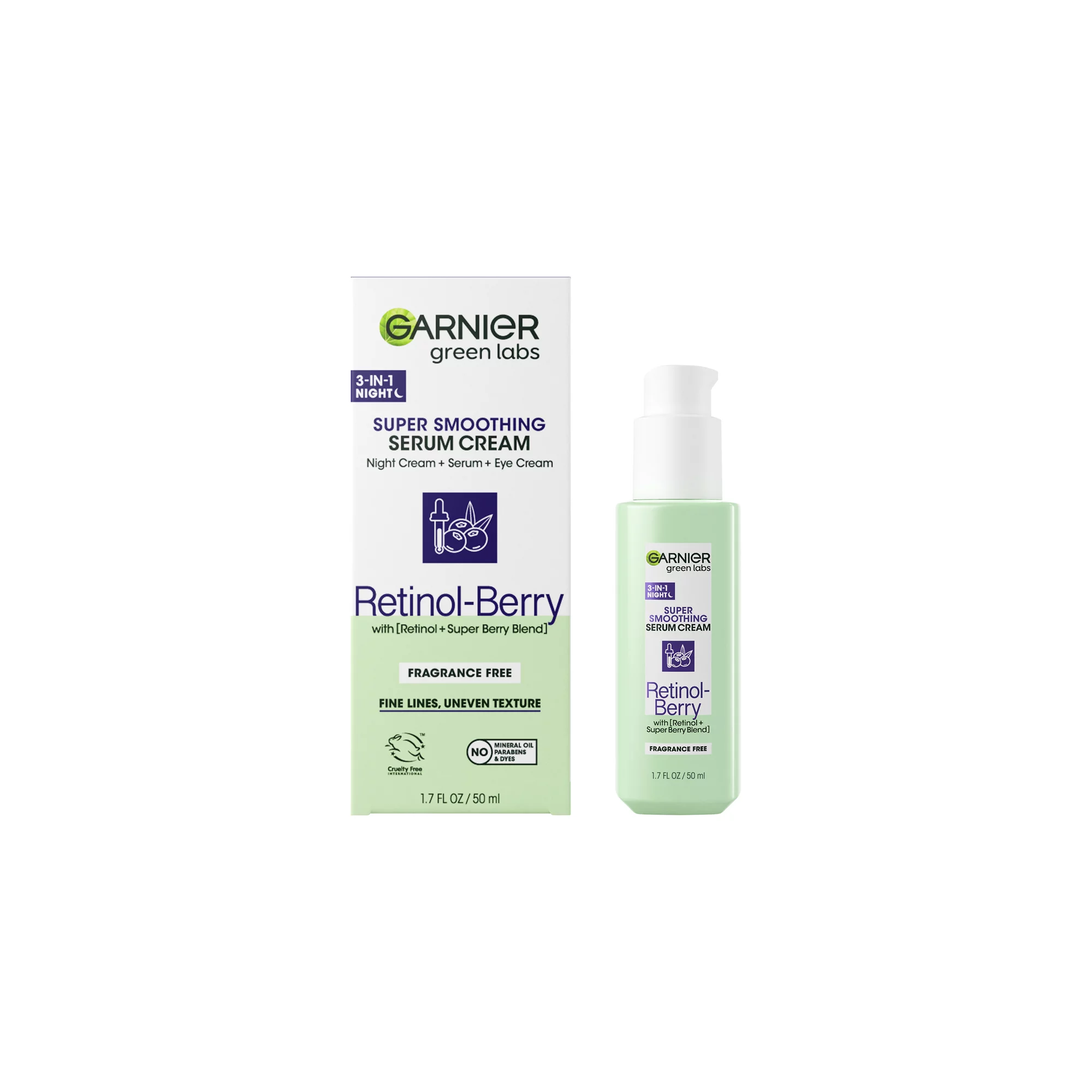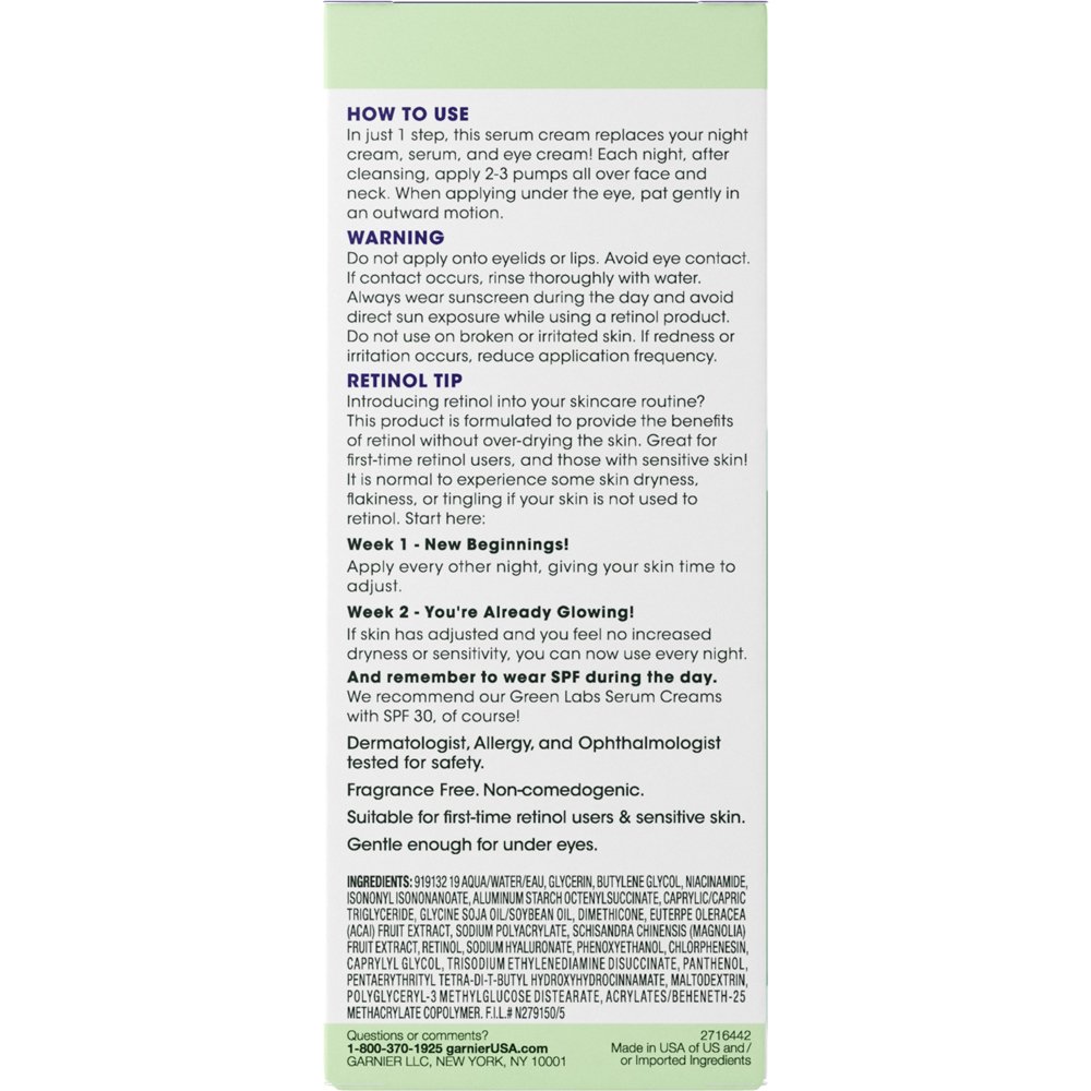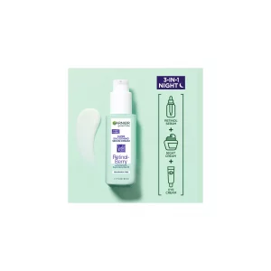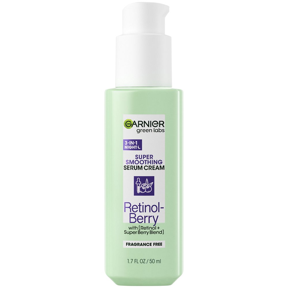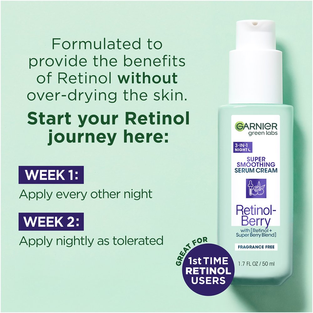 Garnier Green Labs Retinol-Berry Super Smoothing Night Serum Cream is 3 products in 1 bottle: a night cream, a retinol serum, and an eye cream, all in 1 lightweight formula. In an 8-week clinical study, 100 percent of people showed fine line reduction. Renews surface skin cells faster from the 1st use and clinically proven to improve skin appearance in 1 week, tested in a clinical study. This formula, with Retinol and a Super Berry Blend, works to improve fine lines and uneven texture for smoother and healthier-looking skin starting in 1 night. Fine lines are visibly reduced starting in just 1 week. Under eye skin appears well-rested and dark circles are visibly reduced in 1 week.