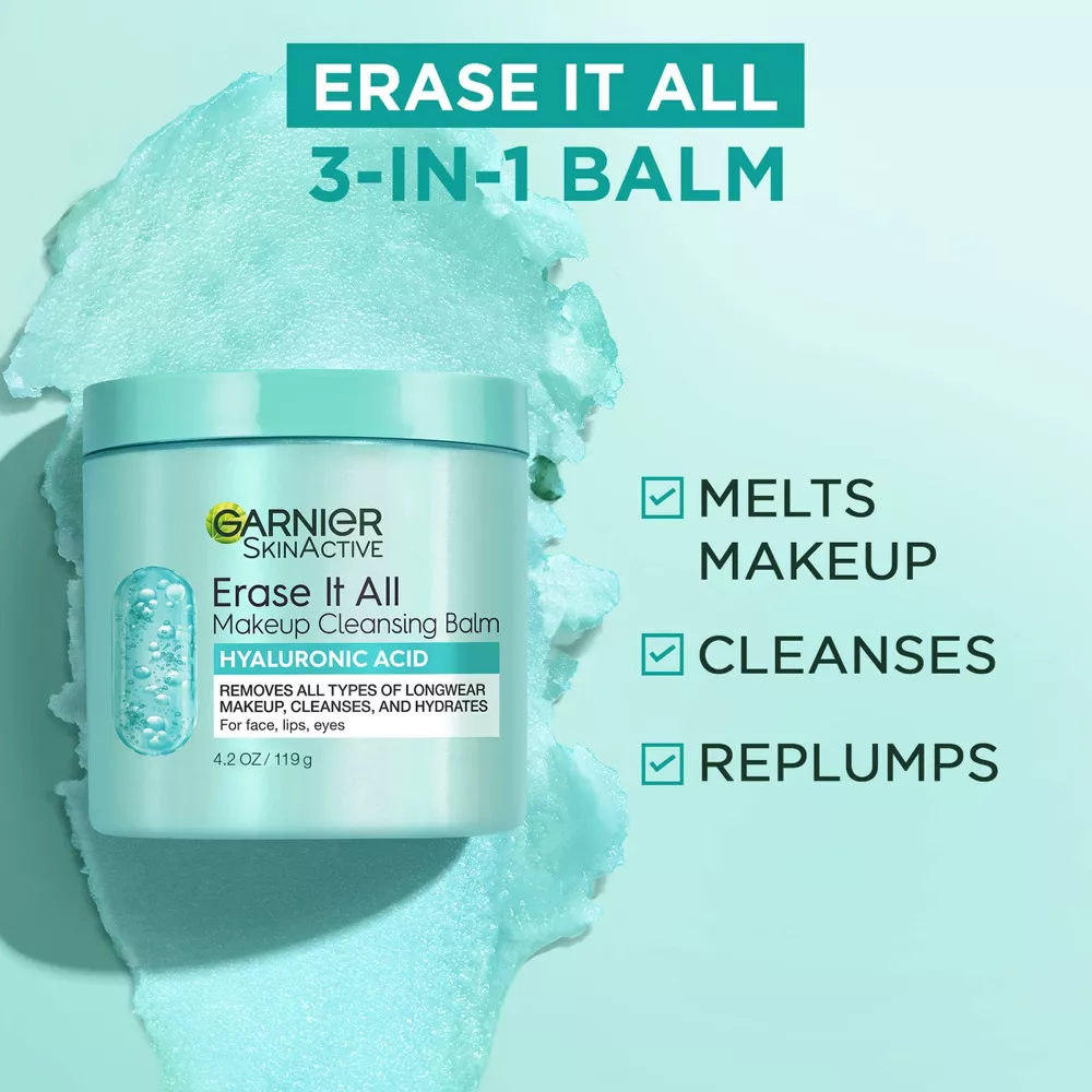 To remove makeup and cleanse your skin, massage a generous amount of balm into dry skin using circular motions. Add water to create a milky lather, and rinse clean with warm water. This 3-in-1 Cleansing Balm can also be used as a mask by applying it to clean skin for 10 minutes, 2 to 3 times per week, and rinsing it with warm water. Avoid getting in eyes. Rinse eyes thoroughly if contact occurs. Follow up with Garnier Micellar Water with Hyaluronic Acid for a full replumping routine.