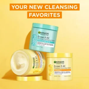 Garnier SkinActive Erase It All Makeup Cleansing Balm Vitamin C. This cleansing balm, specially formulated with Vitamin C, cleanses, and gently removes all types of long wear makeup: eye, lips, face, and sunscreen residue. Thanks to the Vitamin C powered formula, skin looks instantly and overtime brighter while leaving skin hydrated for 24H with non-greasy finish. It is fragrance free, sulfates free, silicones free and non-comedogenic – won’t clog pores. Dermatologists and ophthalmologists tested for efficacy and safety. Garnier is approved by Cruelty Free International.
