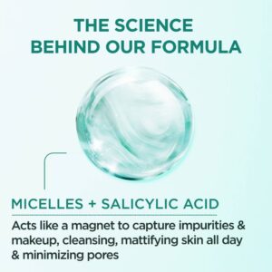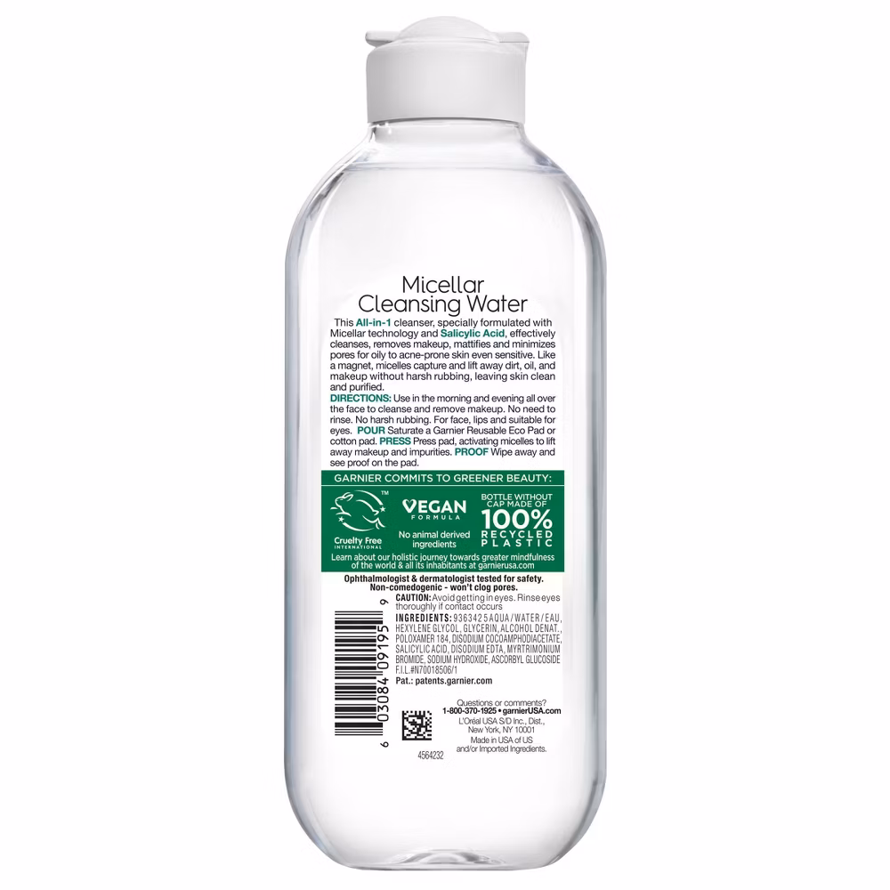 All-In-1 Micellar Cleansing Water: Garnier Micellar Cleansing Water with Salicylic Acid is a face makeup remover, eye makeup remover, and facial cleanser formulated for oily and acne-prone skin to remove makeup, mattify skin all day and minimize pores in just one step