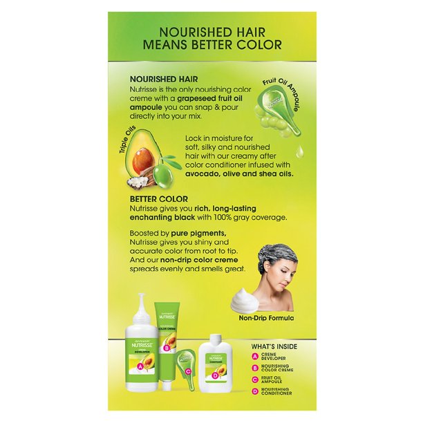 Garnier Nutrisse hair color creme nourishes while you color with avocado, olive, and shea oils. The nourishing color creme enriched with fruit oil concentrate, penetrates deep into hair fibers to nourish and condition your hair so it takes color better and holds it longer, root-to-tip. Garnier Nutrisse delivers rich, radiant, long-lasting hair color with 100% grey coverage. Permanent, nourishing hair color creme with three fruit oils- avocado, olive, and shea The only hair color creme with a separate ampoule of grape seed oil to start nourishing as you color Rich, radiant, long-lasting color with 100 percent grey coverage Available in 45 Nourishing Shades Made in Mexico Always read the hair color instructions insert in the box. Store between 50 and 80 F.
