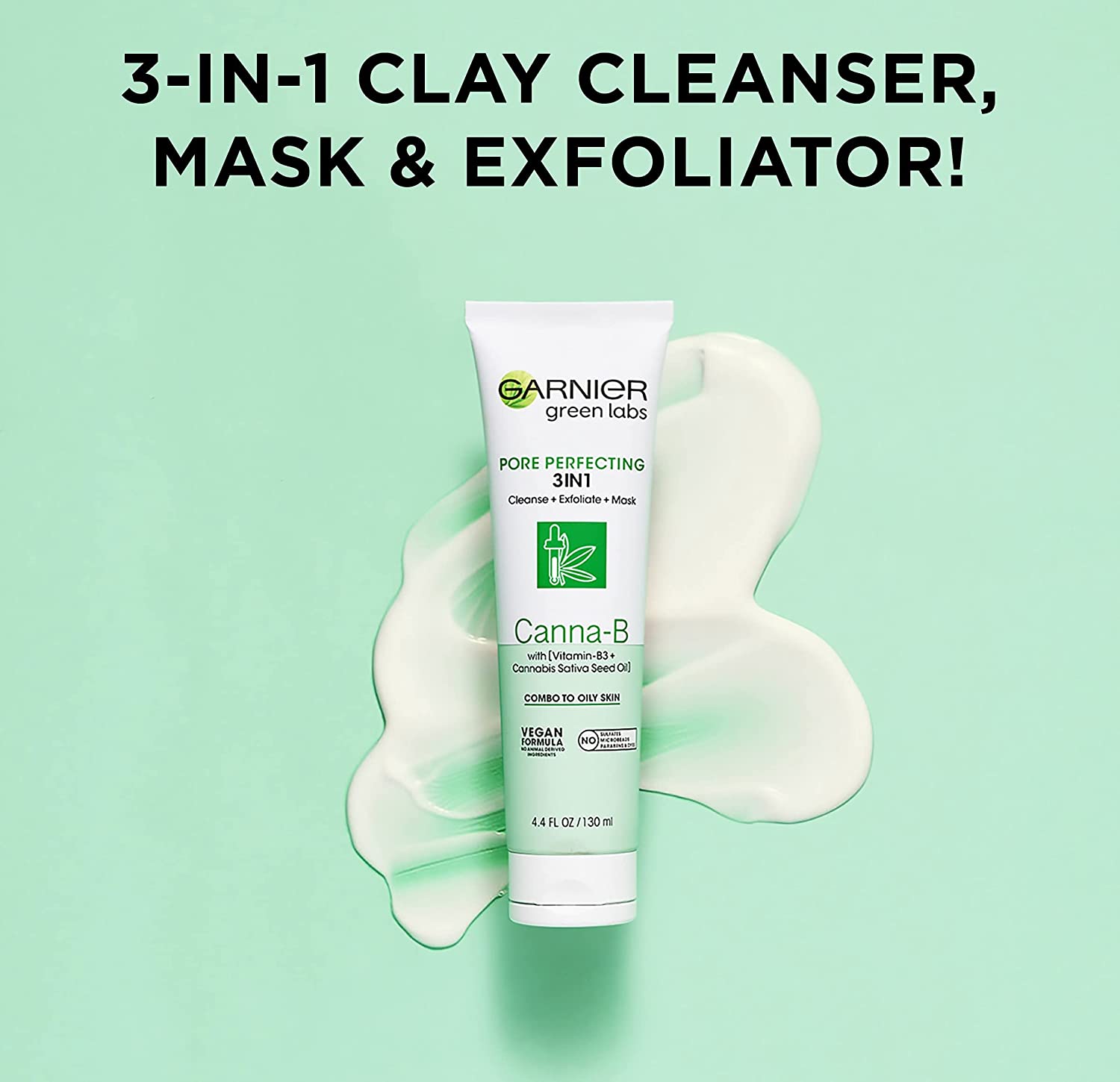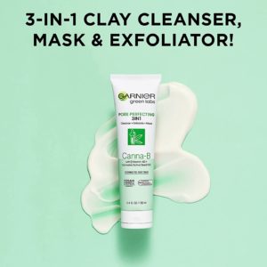 Garnier Green Labs Pore Perfecting 3-in-1 Face Wash + Exfoliator + Face Mask is a scrub-free face wash, gentle exfoliator, and face mask. This clay formula, with Cannabis Sativa Seed Oil and Niacinamide Vitamin B3, deeply cleanses, provides shine control, and tightens pores. This vegan facial cleanser is suitable for all skin types and skin tones, allergy tested & dermatologist tested for safety and suitable for sensitive skin. No sulfates, microbeads, parabens, or dyes.