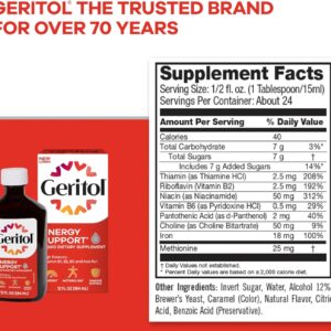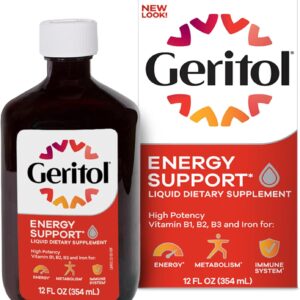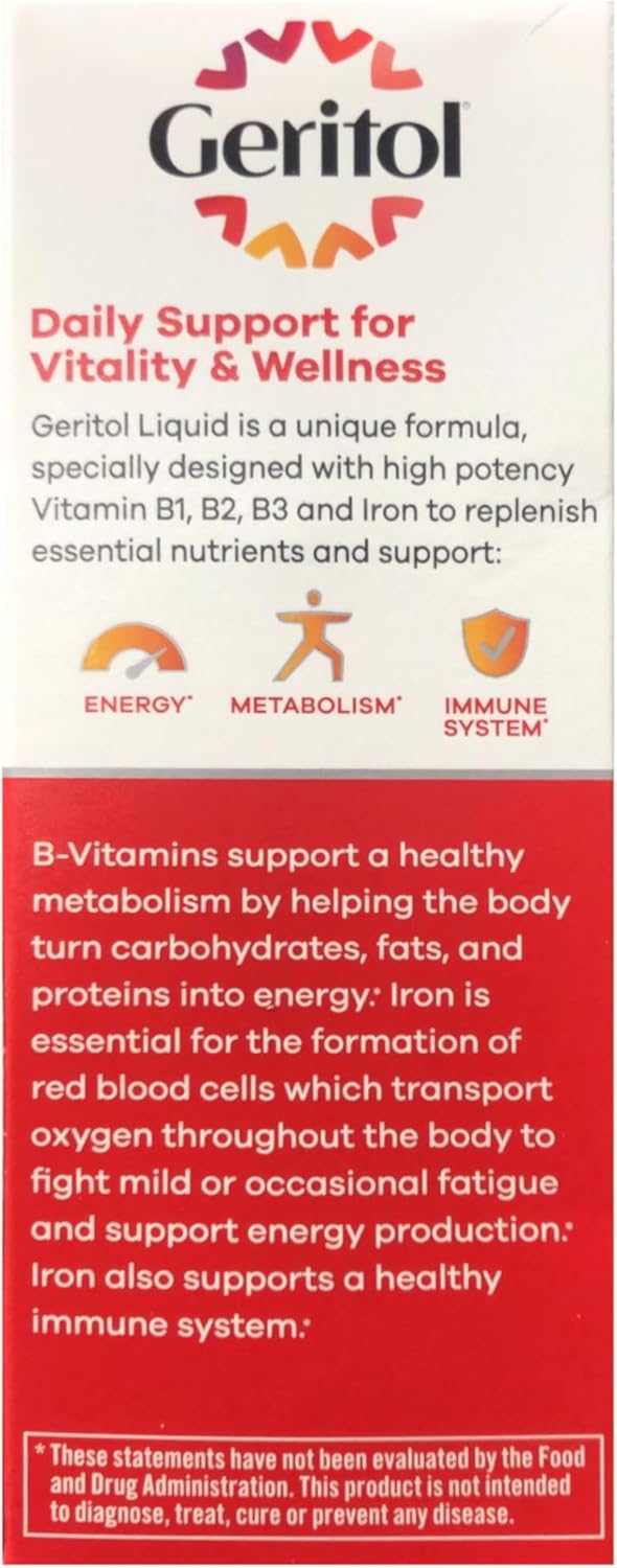 - Energy Support When You Need It: Geritol liquid iron supplement and multivitamin replenishes daily the essential vitamins and minerals that help with energy production in the body leaving you feeling energized