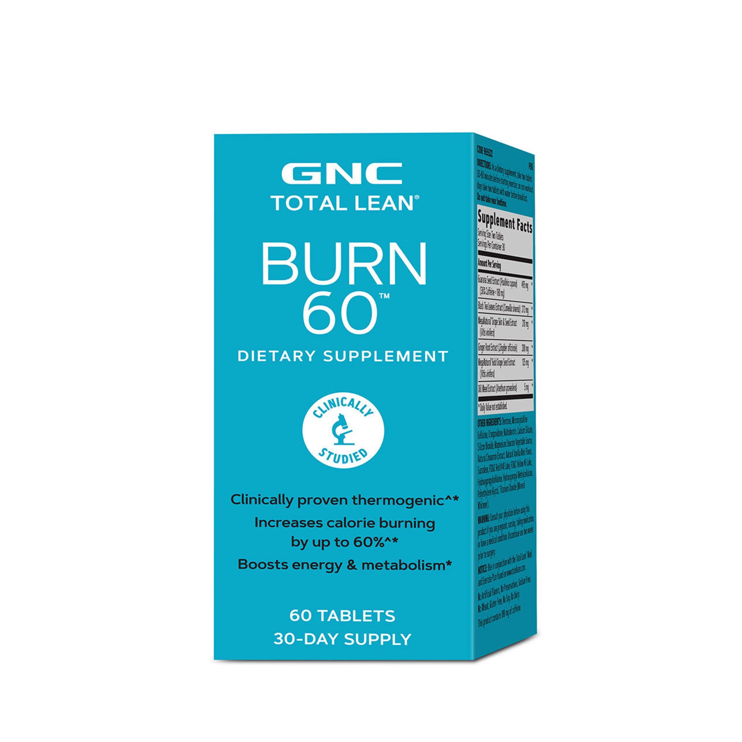 GNC Burn 60™ is a clinically proven thermogenic formula^* that helps to enhance metabolism, burn calories and boost energy levels.* With its powerful ingredients, Burn 60™ enhances metabolism. For best results, use the healthy diet and exercise program included with Burn 60™.
