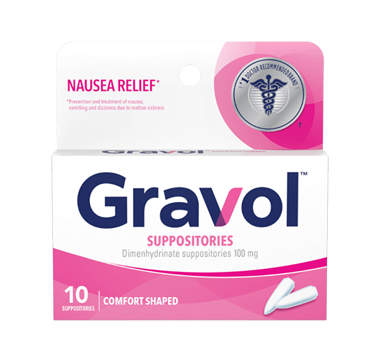 If keeping food and liquids down is a problem, or if vomiting due to motion sickness has already started, Gravol Comfort-Shaped Suppositories are the dosage form of choice to ensure effective relief. This product contains the active drug Dimenhydrinate, for the prevention and treatment of nausea, vomiting and dizziness due to motion sickness.