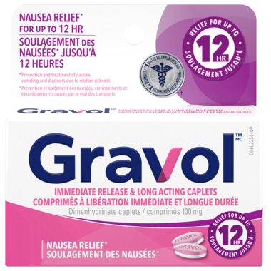 Gravol Immediate Release & Long Acting Caplets provide relief of nausea for up to 12 hours. This product contains the active drug Dimenhydrinate (100 mg), for the prevention and treatment of nausea, vomiting and dizziness due to motion sickness. Gravol Immediate Release & Long Acting Caplet is for the prevention and treatment of nausea, vomiting and dizziness due to motion sickness.