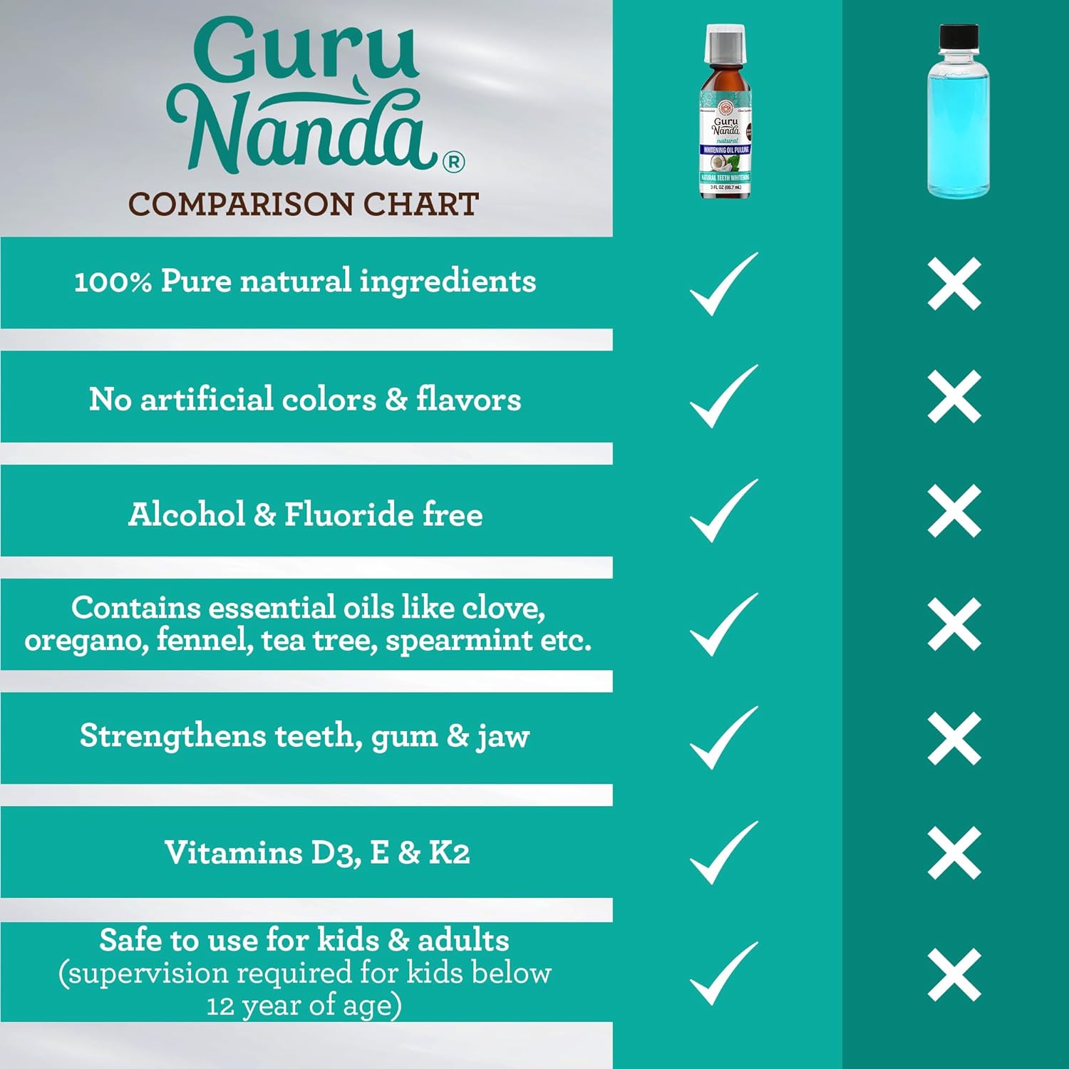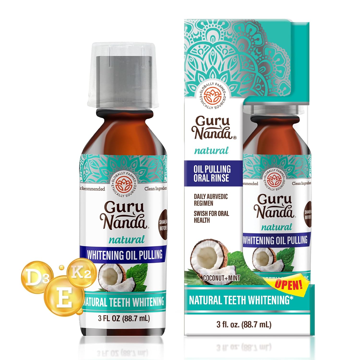 - MICKEY D’S FORUMLA: Gurunanda oil pulling is a natural fresh breath & teeth whitening mouthwash with an ayurvedic blend of fractionated coconut oil, seven pure essential oils, and Vitamins D3, E, and K2.