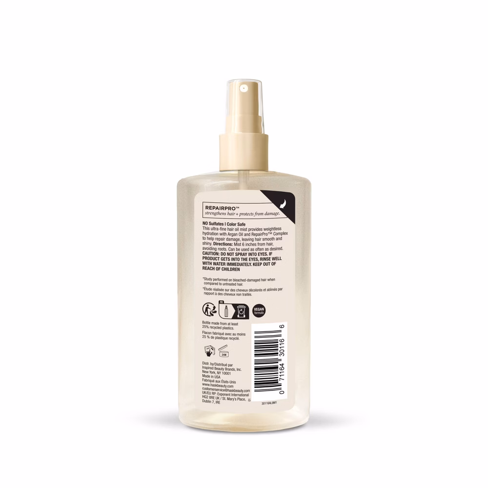An ultra-fine, lightweight hair oil mist that provides weightless hydration while repairing hair damage up to 98%*. Formulated with a delicate blend of oils, including repairing Argan Oil, and RepairPro™ to repair damage for softer, smoother and shinier hair. Inspired by big-budget hair oil mists, HASK’s Weightless Repair Hair Oil Mist provides premium performance at an accessible price.