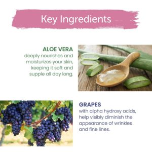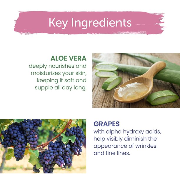 - WITH ALOE VERA & GRAPES: To nourish and moisturize your skin, and provide alpha hydroxy acids to help visibly diminish wrinkles and fine lines.