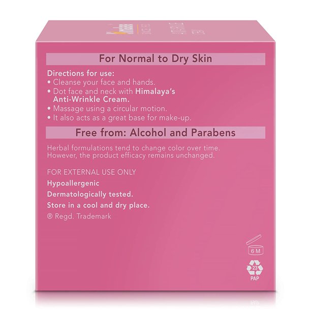 Himalaya’s Anti-Wrinkle Cream gives you the perfect solution for visibly younger looking skin. Combined with a rich blend of botanical extracts, this silky and velvety cream visibly diminishes the appearance of wrinkles and fine lines, leaving your skin soft, supple and moisturized. The cream penetrates your skin and provides essential benefits to help keep those worry lines away.