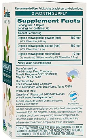 - CLINICAL STRENGTH THAT MEETS YOUR NEEDS: Unlike regular Ashwagandha gummies, Ashwagandha capsules, or even KSM Ashwagandha, Himalaya Organic Ashwagandha caplets are made with a unique combination of 280 mg of root extracts, 10 mg of supercritical CO2 extracts and 380 mg of Ashwagandha root powder to give you a highly efficacious Organic Ashwagandha concentration in just one caplet a day.