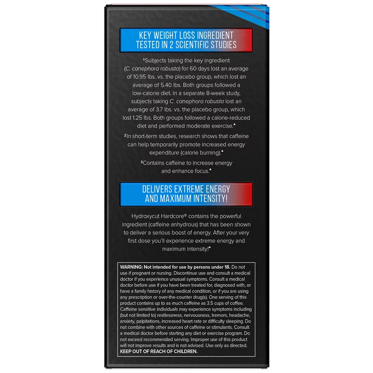Achieve the weight loss and energy you’ve been looking for with Hydroxycut Hardcore. Hydroxycut is the perfect weight loss supplement to help you reach your weight loss goals. Unlike other weight loss products, Hydroxycut is formulated with a weight loss driver backed by 2 scientific studies. The weight loss product continues to help countless people on a daily basis also contains caffeine anhydrous to give you fast acting energy and also help boost your metabolism. Losing weight with the Hydroxycut weight loss formula has never been more convenient with 30 servings per bottle. Subjects using the key weight loss ingredient in Hydroxycut (C. canephora robusta) for 60 days lost an average of 10.95 lbs. with a low calorie diet, and 3.7 lbs. in a separate 8 week study with a calorie reduced diet and moderate exercise.