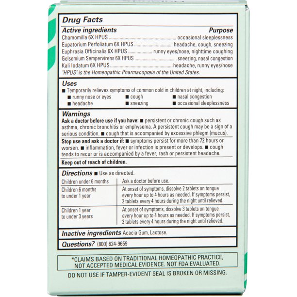 Hyland’s Baby Nighttime Tiny Cold Tablets, Natural Relief of Runny Nose, Congestion, and Cold Symptoms at Night, 125 Quick-Dissolving Tablets. Temporarily relieves the symptoms of runny nose and eyes, nighttime cough, congestion, headache, sneezing and occasional sleeplessness due to common head colds in children