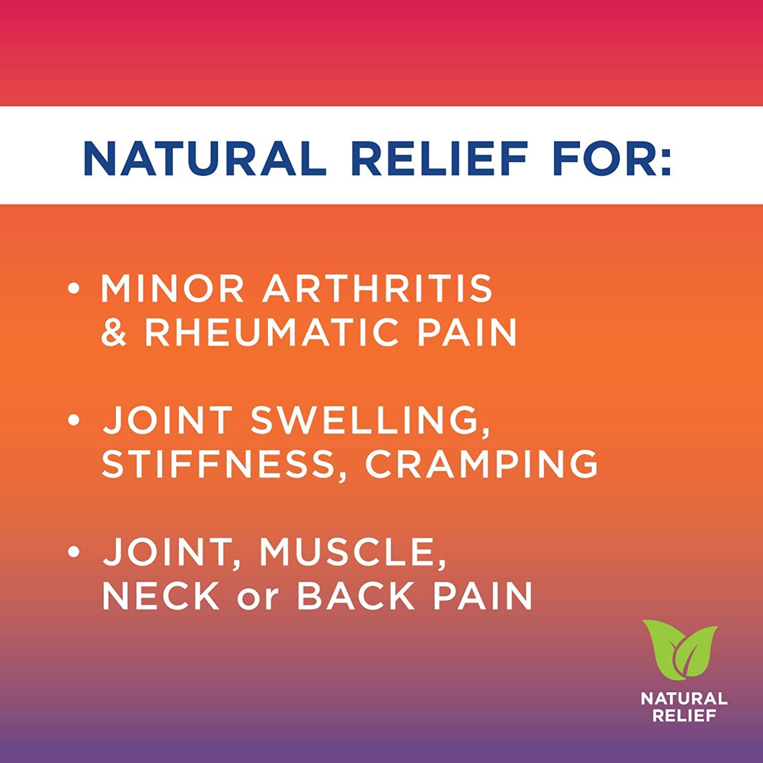 - NATURAL RELIEF FOR MINOR ARTHRITIS AND RHEUMATIC PAIN: joint swelling, stiffness, cramps and joint, muscle, back or neck pain