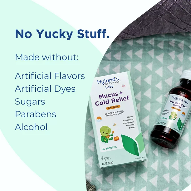 Hyland’s Naturals Baby Mucus + Cold Relief Syrup Daytime provides Natural Relief of Congestion, Runny Nose & Cough 4 Ounces Temporarily relieves symptoms of colds, including accumulation of mucus in chest, throat and nose; cough with mucus; runny nose, sneezing and nasal congestion*. Hyland’s Naturals is a leading consumer health brand with more than a century of history making high quality products to help people live healthier and happier lives. Made with natural active ingredients, our products contain no artificial flavors or sugars, dyes or parabens.
