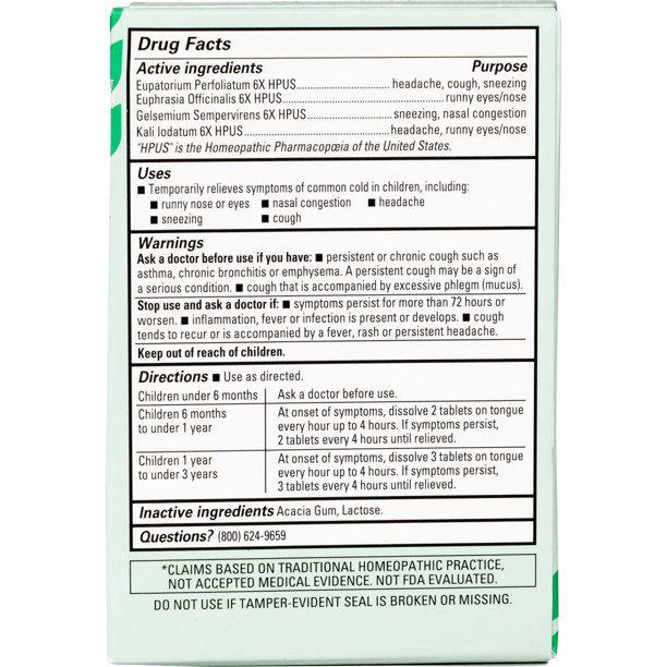 Quick-dissolving tablets that melt in your baby’s mouth instantly to relieve runny nose and eyes, cough, congestion, headache and sneezing due to common head colds in babies 6 months+