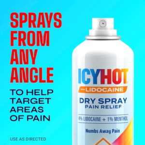 Make a comeback from pain with Icy Hot Lidocaine Pain Relief Dry Spray. Each can is formulated with pain-relieving ingredients menthol 1% and maximum-strength* lidocaine 4% to target and numb aggravated nerves and reduce pain signals for temporary relief. The fast-acting dry spray starts working instantly for temporary relief of minor pain, including backaches, lower back, neck, shoulder, knee, elbow, ankle and leg pain; and pain from strains, sprains and bruises. Each can is designed to spray from any angle so you can easily apply the quick-drying liquid onto the affected area. Keep Icy Hot Lidocaine Spray in your gym or work bag to deliver powerful pain relief on the go. *Among OTC topical analgesics for the indicated use(s)