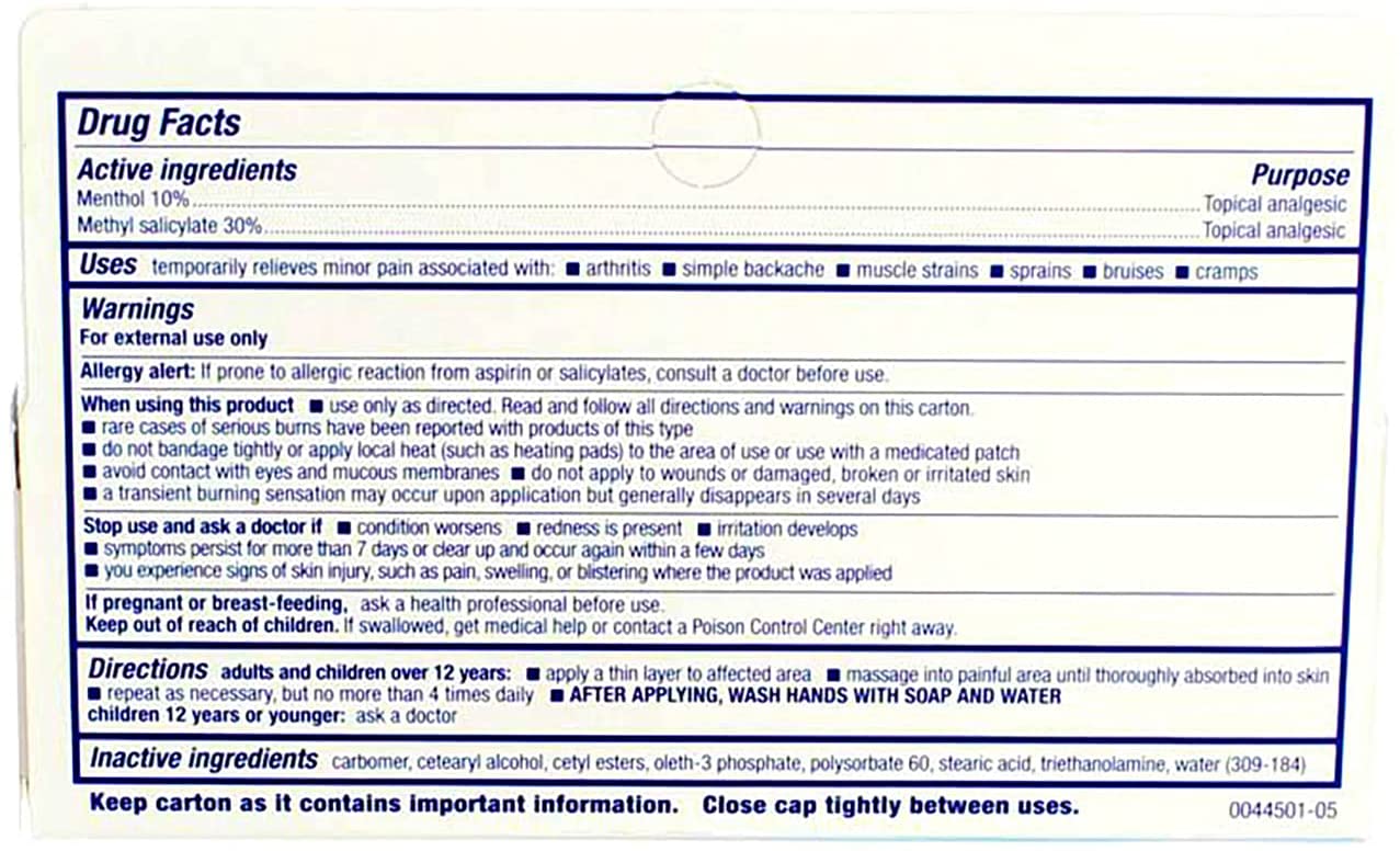 Menthol 10 %; Methyl Salicylate 30 %; Carbomer; Cetyl Esters; Emulsifying Wax; Oleth-3 Phosphate; Stearic Acid; Triethanolamine; Water