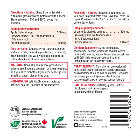 Jamieson’s Apple Cider Vinegar Gummies are formulated with Chromium to helps to metabolize fats and helps to maintain healthy blood sugar (glucose) levels in the body, and are available in a fun and delicious red apple flavour.