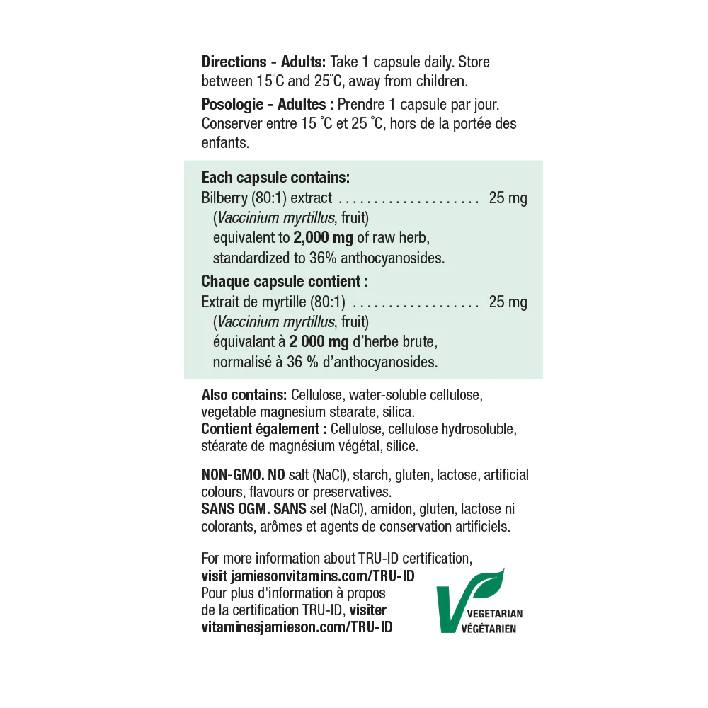Jamieson Bilberry, also known as wild European blueberry extract, is a powerful antioxidant that helps support eye and circulatory health.