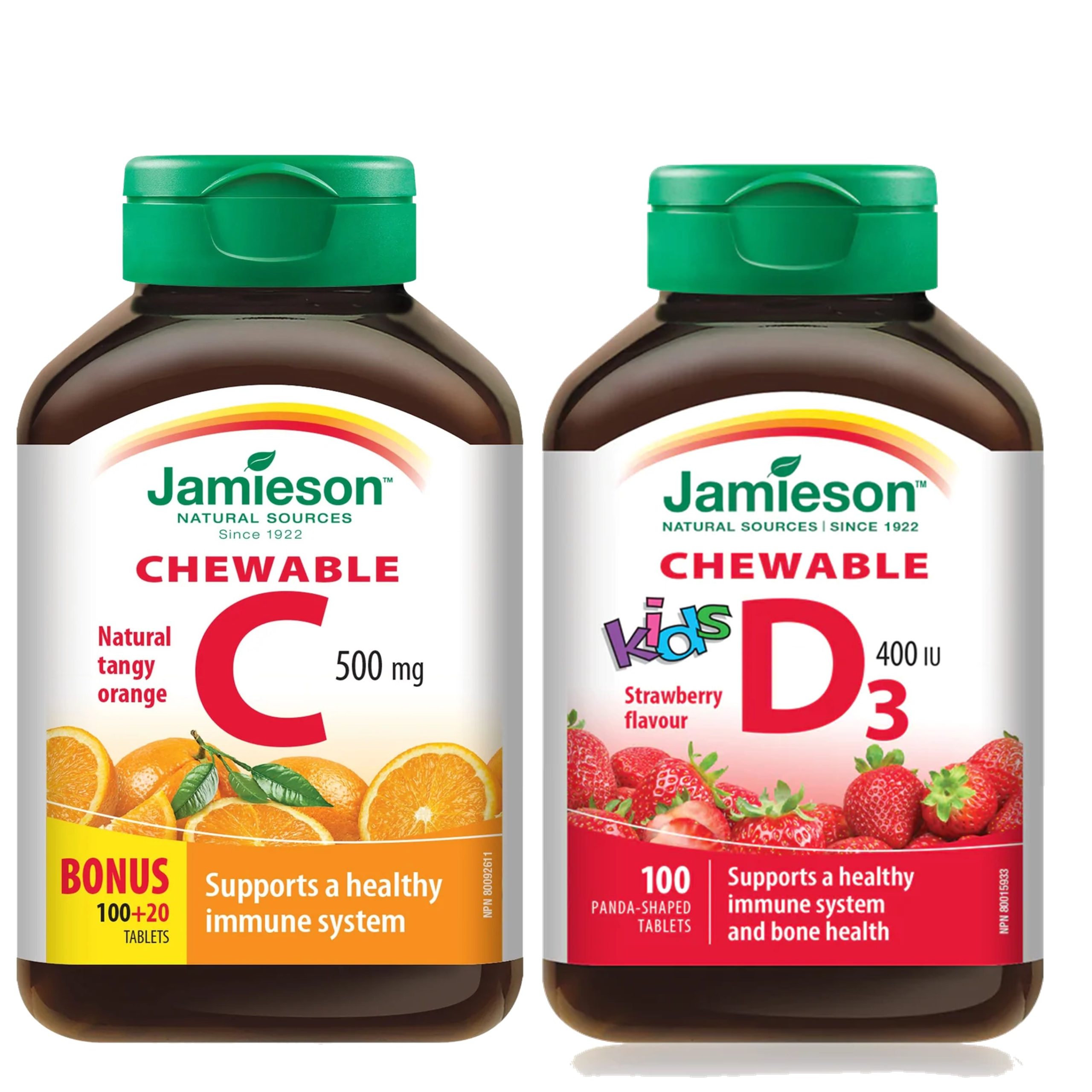 Jamieson Chewable Vitamin D for Kids – Strawberry-100 tabs + Jamieson Vitamin C 500mg Chewable BANDED OFFER
