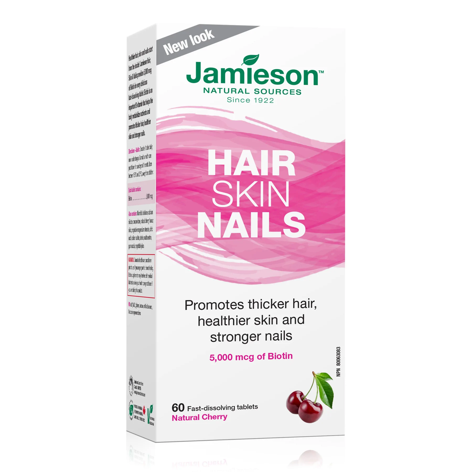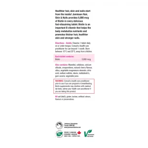 Healthier hair, skin and nails start from the inside! Jamieson Hair, Skin & Nails provides 5,000 mcg of Biotin in every delicious fast-dissolving tablet. Biotin is an important B vitamin that helps the body metabolize nutrients and promotes thicker hair, healthier skin and stronger nails.