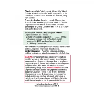 Jamieson Echinacea 1,200 mg is a high potency, organic formula of pure Echinacea purpurea. Echinacea has been used traditionally in herbal medicine to fight off upper respiratory tract infections, relieve cold symptoms, and shorten the duration of colds and flu.