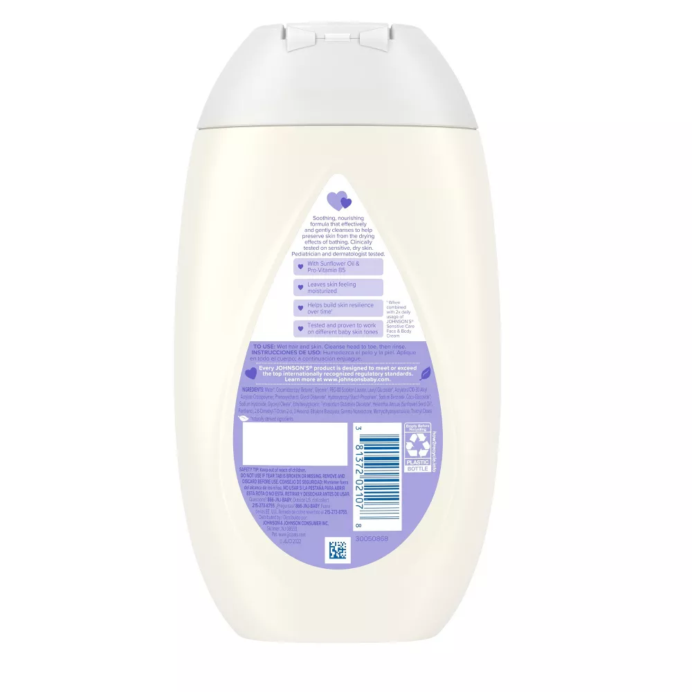 Gently cleanse without drying or irritating baby’s sensitive, dry skin with Johnson’s Sensitive Care Baby Body Wash and Shampoo. This soothing and nourishing 2-in-1 body wash and shampoo helps preserve baby’s delicate skin from the drying effects of bathing. The lightly scented daily cleanser is formulated with sunflower oil and Pro-Vitamin B5 to leave baby’s sensitive skin feeling moisturized. The clinically tested baby wash and shampoo is proven to be gentle and helps build skin resilience over time.* A great addition to your baby’s daily skincare routine, the lightly scented wash is hypoallergenic, tear-free and formulated to be free of sulfates, parabens, phthalates, and dyes.*when combined with 2x daily usage of Johnson’s Sensitive Care Face and Body Cream*when combined with 2x daily usage of Johnson’s Sensitive Care Face and Body Cream