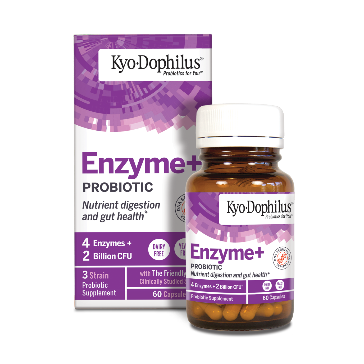 Kyo-Dophilus Enzyme+ Probiotic contains four key digestive enzymes in combination with three biocompatible human strain probiotics, The Friendly Trio®. The powerful enzymes in this formulation assist the body’s natural ability to break down proteins, fats, carbohydrates and dairy into absorbable nutritional elements. The probiotic blend supports digestion by helping to regulate the healthy bacteria and normalize the GI system.*