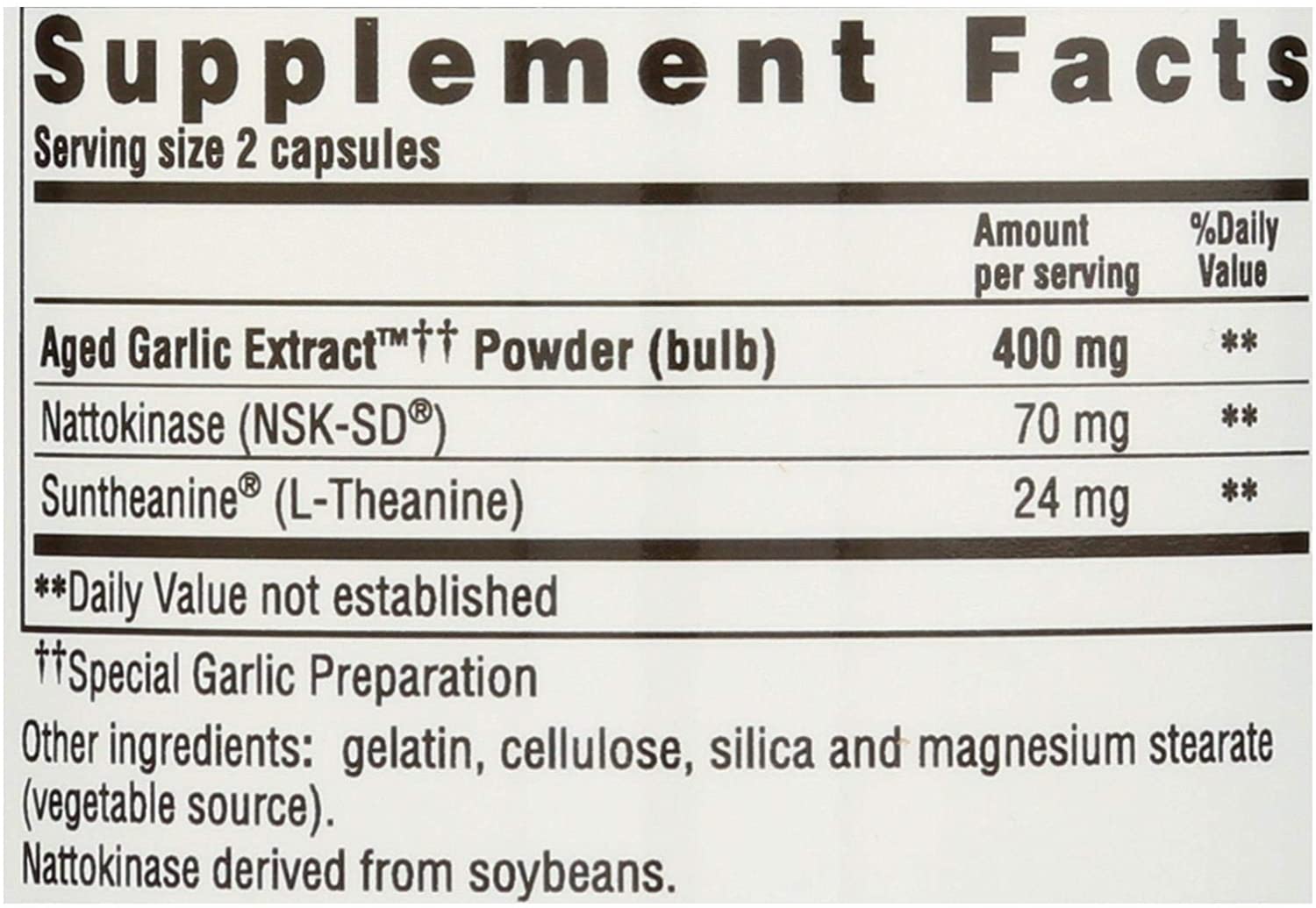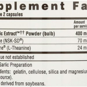 Kyolic® Aged Garlic Extract™ Formula 109 for Blood Pressure Health contains 400 mg of AGE along with Nattokinase, an enzyme extracted from natto (fermented soy) and L-Theanine, a nutrient found in green tea per serving (2 capsules; Recommend two servings per day). Clinical studies for each of these ingredients have shown to support healthy blood pressure levels, already within normal ranges.
