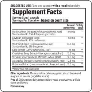 - Traditional Herbal Support: Contains traditional herbs to support women’s changing bodies; Black Cohosh Root Extract, Soybean Isoflavones, Wild Yam, Sage, Chastetree Berry, Vervain, Astragalus and Motherwort Extracts