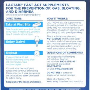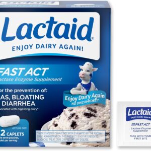 - 32-count single-dose travel packs of Lactaid Fast Act Lactose Intolerance Caplets to help prevent gas, bloating and diarrhea associated with lactose intolerance