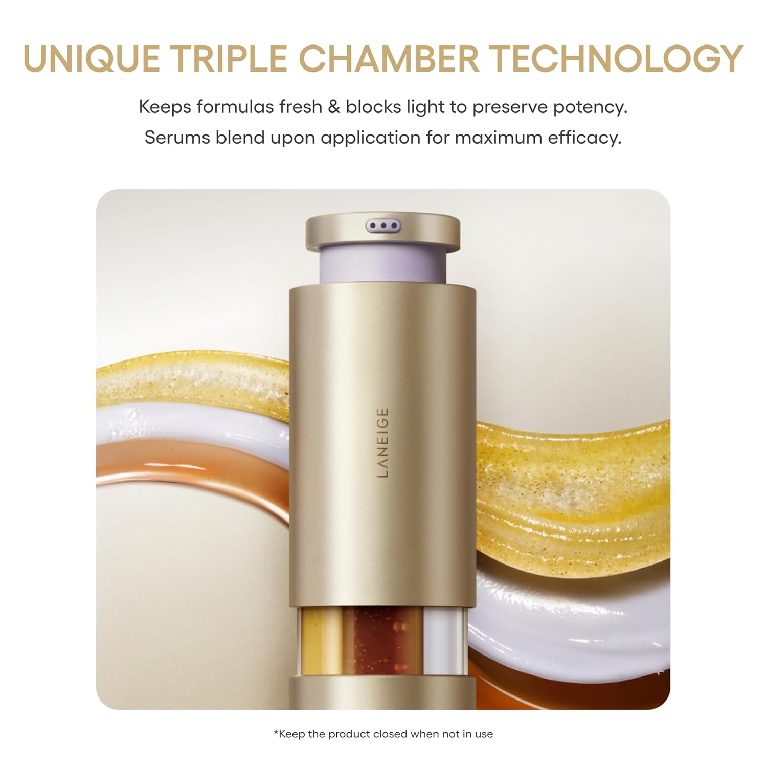 Three gentle serums target skin three ways to improve fine lines, firmness, & glow. The unique triple chamber packaging blocks out light to help keep the formulas fresh & potent while they are not in use.