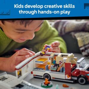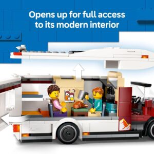 Kids can use their imagination to explore the great outdoors with the LEGO City Holiday Adventure Camper Van (60454) building set for 6-year-old boys and girls. This fun LEGO camper van toy comes with realistic features, including a modern living space with a kitchen, toilet, bunk beds, a crib, plus a table and 2 chairs for indoor and outdoor use. Kids can engage in storytelling fun with mom and dad minifigures, as they sit around the campfire playing songs on the guitar with baby minifigure by their side. This LEGO City camping toy for kids includes a step-by-step printed construction guide. Kids can also enjoy an intuitive building adventure with the LEGO Builder app, where they can zoom in, rotate the models in 3D, track their progress as they build, and explore and save other playsets. LEGO City Great Vehicles playsets feature land, air and water toys for hours of imaginative play. Expand the fun and add this toy to other LEGO City sets (sold separately). Contains 385 pieces.