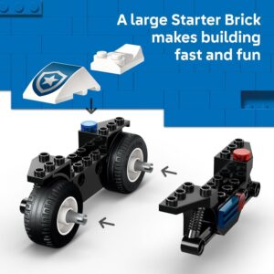 Young crime fighters 4 years old and up can help the police officer minifigure catch a sneaky crook minifigure with the LEGO City Police Motorcycle Chase (60455) building toy. Kids will love constructing the fast police motorcycle (with wide tires built for pursuit) as well as the crook’s quick getaway skateboard, then imagining high-speed escapes through the city streets. The detailed mini-ATM opens to reveal a toy money inside, setting the stage for thrilling crime-stopping missions. Little builders can create endless chase scenarios as the police officer races to stop the skateboarding crook before he escapes with the stolen cash. This easy-build police playset includes a helpful Starter Brick element and simple pictorial instructions perfect for developing builders. The set features a police officer minifigure ready for action and a mischievous crook minifigure, plus exciting accessories like handcuffs, a flashlight, a crowbar, and a wanted poster to enhance the storytelling adventure. Perfect for everyday heroes who love pretend play and building toys, this action-packed set helps develop confidence and creative thinking skills. LEGO City sets (each set sold separately) can be connected for even bigger community adventures. The LEGO Builder app enhances the experience with helpful 3D viewing tools. Contains 65 pieces.