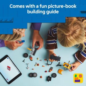 - ACCESSORIES & MINIFIGURES – This construction truck site toy includes a buildable toy wheel loader, driver and worker minifigures, a roadwork sign, traffic cones and a toy jackhammer