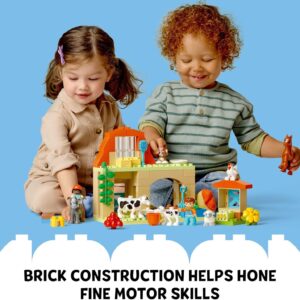Know a toddler who loves farm playsets? The Caring for Animals at the Farm (10416) set is the ideal gift for any little animal-lover. This kids’ learning farm animal toy for toddlers aged 2 years old and up comes with 8 LEGO DUPLO animal figures – including horse, sheep, cow and chicken figures – to delight any toddler who loves real life role play toys, and making new farmyard friends. This feature-rich farm playset for toddlers immerses families in nurturing play, as grown-ups show their preschooler how to feed and care for the animals. The farmer in the farmhouse helps the child figure wash the apples to feed to the cow and her calf. In the chicken coop, the hen is caring for her chicks. Toddlers can also imagine taking a ride on the horse figure and feeding it hay in the stable. This educational toy consists of colored bricks and pieces that are designed to be engaging for toddlers. Watch as they explore and assemble, while building their problem-solving abilities and their fine motor skills. Contains 74 pieces.