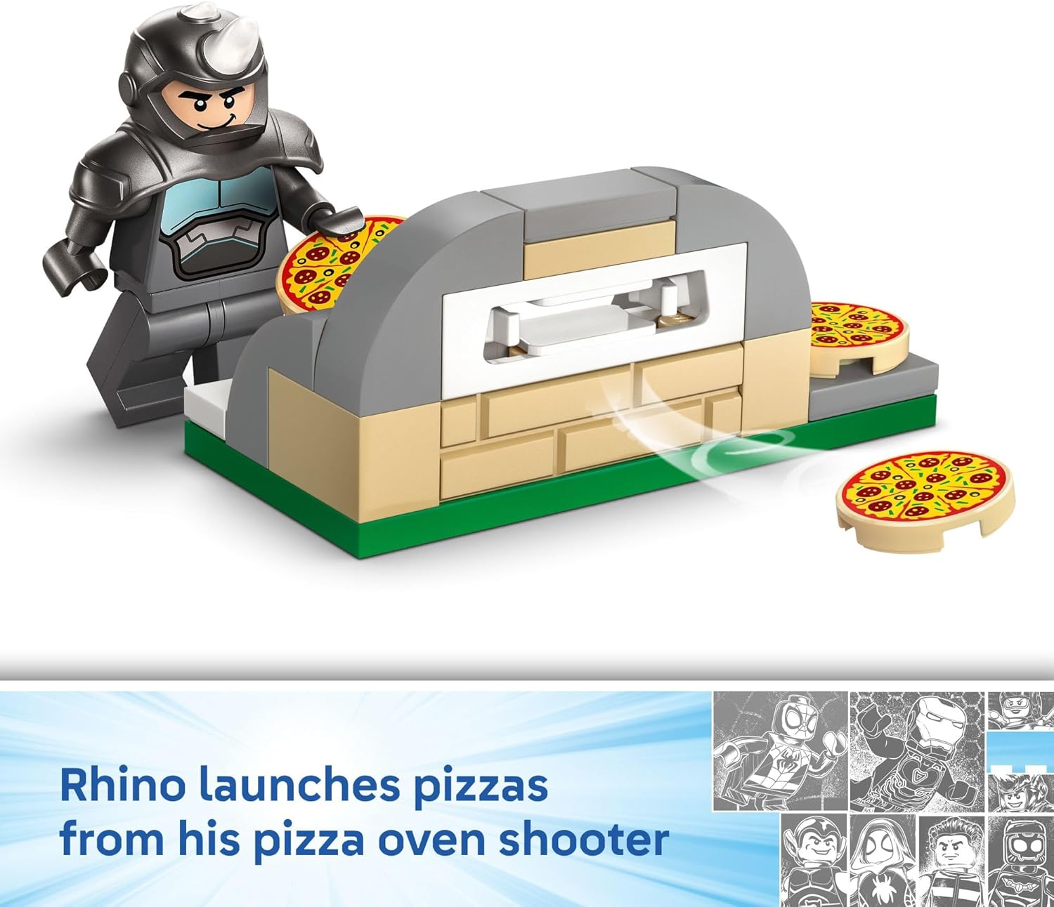 - MARVEL ACTION ON WHEELS – Kids help Spidey retrieve a stolen blue gem, dodge flying pizzas launched from Rhino’s pizza oven shooter, and capture Rhino in a giant spiderweb trap