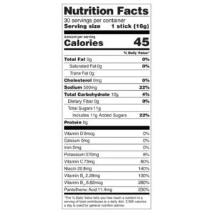 Ingredients: Pure Cane Sugar, Dextrose, Citric Acid, Salt, Potassium Citrate, Sodium Citrate, Dipotassium Phosphate, Silicon Dioxide, Stevia Leaf Extract (Rebaudioside A), Vitamin C (Ascorbic Acid), Natural Flavors, Vitamin B3 [Niacinamide], Vitamin B5 [D-Calcium Pantothenate], Vitamin B6 [Pyridoxine Hydrochloride], Vitamin B12 [Cyanocobalamin].