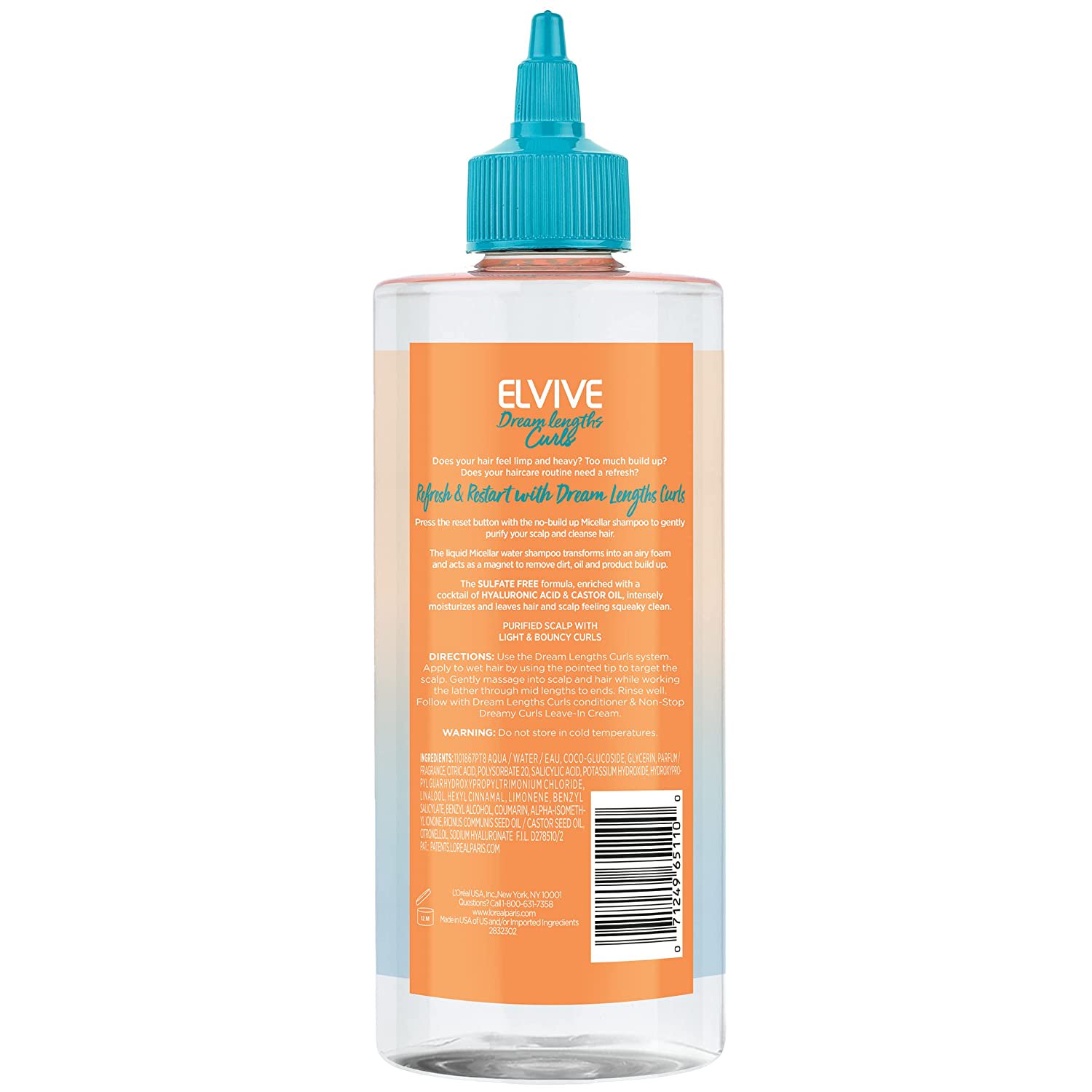 Loreal Paris Elvive Dream Lengths Curls No Build-Up Micellar Shampoo, With Hyaluronic Acid And Castor Oil. 16.9 Fl Oz