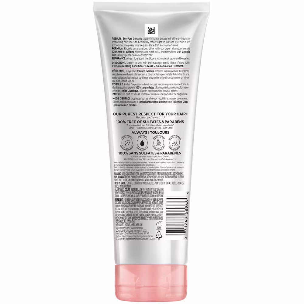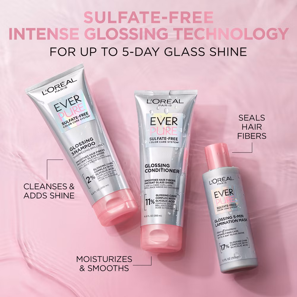 L’Oréal Paris EverPure Hair Glossing hair care system, with glycolic acid, smooths and intensifies shine for color treated, processed, dry, dull and dehydrated hair while protecting color. For a glossy finish, use our EverPure Glossing sulfate free Shampoo and Conditioner, followed by our rinse out mask to seal hair for intense smoothness and a lasting glass shine. EverPure Hair Gloss Treatment is 100% Sulfate Free Shampoo, Conditioner, and Mask, Paraben Free, No Harsh Salts, No Phthalates, No Harsh Surfactants, Dye Free, Gluten Free, Vegan Formula. Validated by Colorists. Safe to use as daily hair care regimen. Our formulas are especially gentle on color treated hair.