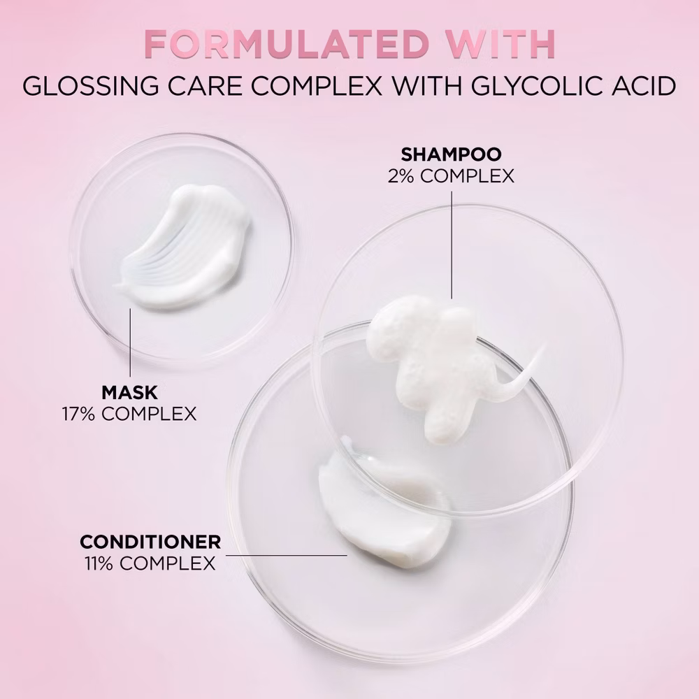 Hair Care Routine for Color Treated Hair: Glossing Shampoo, Conditioner & Hair Mask System, an at-home glossing service with Glycolic Acid, delivers 8x smoother hair & up to five days of intense glass shine for shinier hair than the $82 glossing bundle