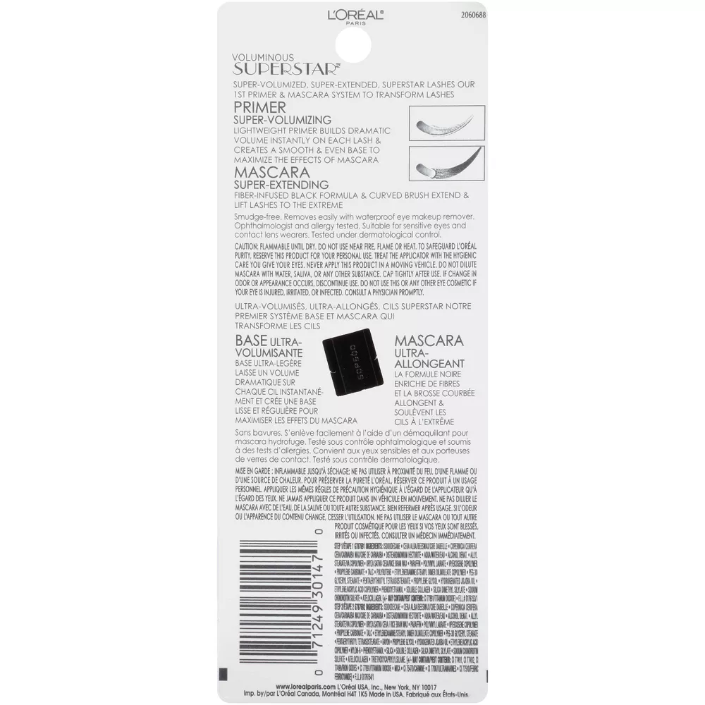 L’Oreal Paris Voluminous Superstar Waterproof Mascara is a two-step primer and lengthening mascara for a show-stopping lash effect. Super-volumizing primer builds dramatic volume on every lash and creates an ultra smooth base to maximize mascara performance. Super-extending mascara with a fiber-rich black formula.