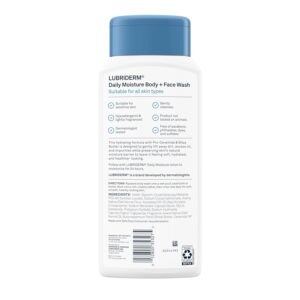 - 16-fluid ounce bottle of Lubriderm Daily Moisture Body + Face Wash, lightly scented hydrating body wash & moisturizing facial cleanser with Pro-Ceramide & shea butter to gently cleanse & help preserve skin’s natural moisture barrier