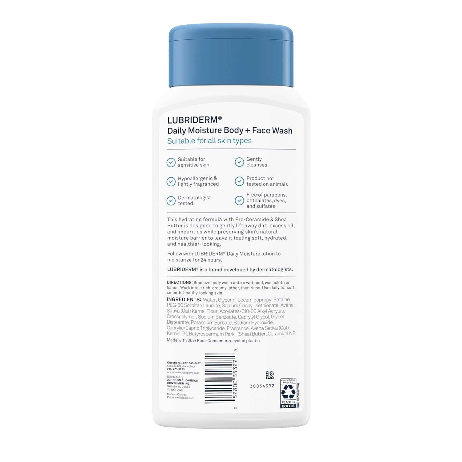 Cleanse and hydrate your skin from head to toe with Lubriderm Daily Moisture Body + Face Wash. This 2-in-1 full body wash and moisturizing face cleanser from a dermatologist-developed brand gently lifts away dirt, excess oil, and impurities to leave skin feeling clean and soft and healthier-looking. Suitable for all skin types, including sensitive skin, the lightly scented daily cleanser features a gentle formula with pro-ceramide and shea butter to preserve skin’s natural moisture barrier. The hypoallergenic, dermatologist-tested body wash is free of sulfates, parabens, phthalates, and dyes, and has never been tested on animals. To use the hydrating face and body wash as part of your daily skincare routine, squeeze onto a washcloth, work into a rich, creamy lather, and then rinse. Follow with your favorite Lubriderm Daily Moisture Lotion to moisturize skin for 24 hours.