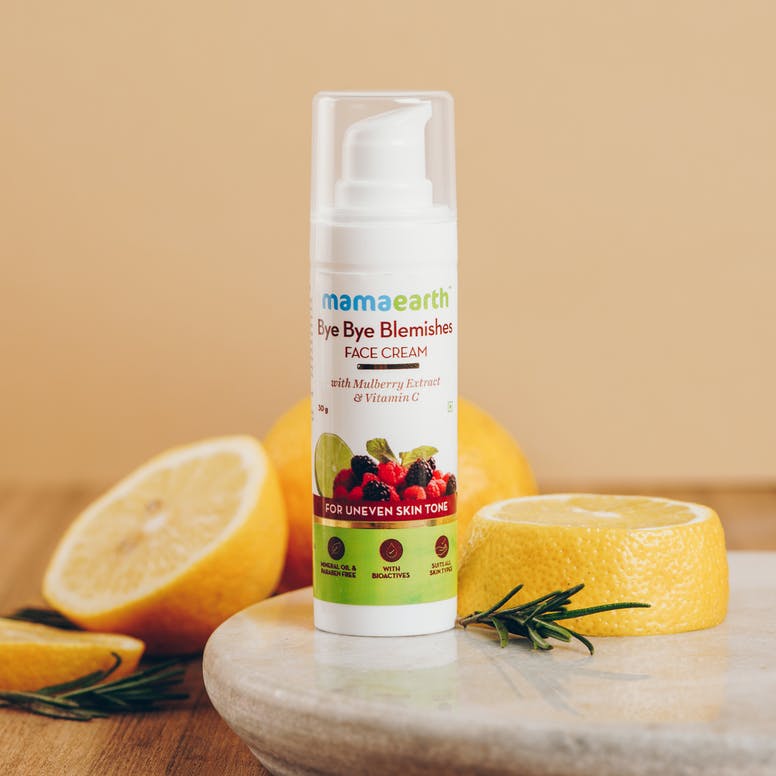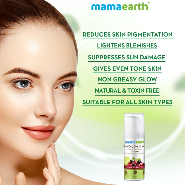 Mamaearth Bye Bye Blemishes Face Cream is an effective cream enriched with Mulberry Extract, Daisy Flower Extract, and Vitamin C. Its unique and natural formulation prevents melanin synthesis and gives you soft and glowing skin. It reduces pigmentation by restricting melanin deposits that appear as dark spots, patches, and hyper-pigmentation, thereby offering an even skin tone. It also has anti-bacterial and anti-fungal properties. It is non-greasy and gets absorbed by the skin quickly. The cream is dermatologically tested and can be used on oily, normal, dry, combination and sensitive skin. The product has no harsh chemicals and is free of SLS, Parabens and Mineral Oils.