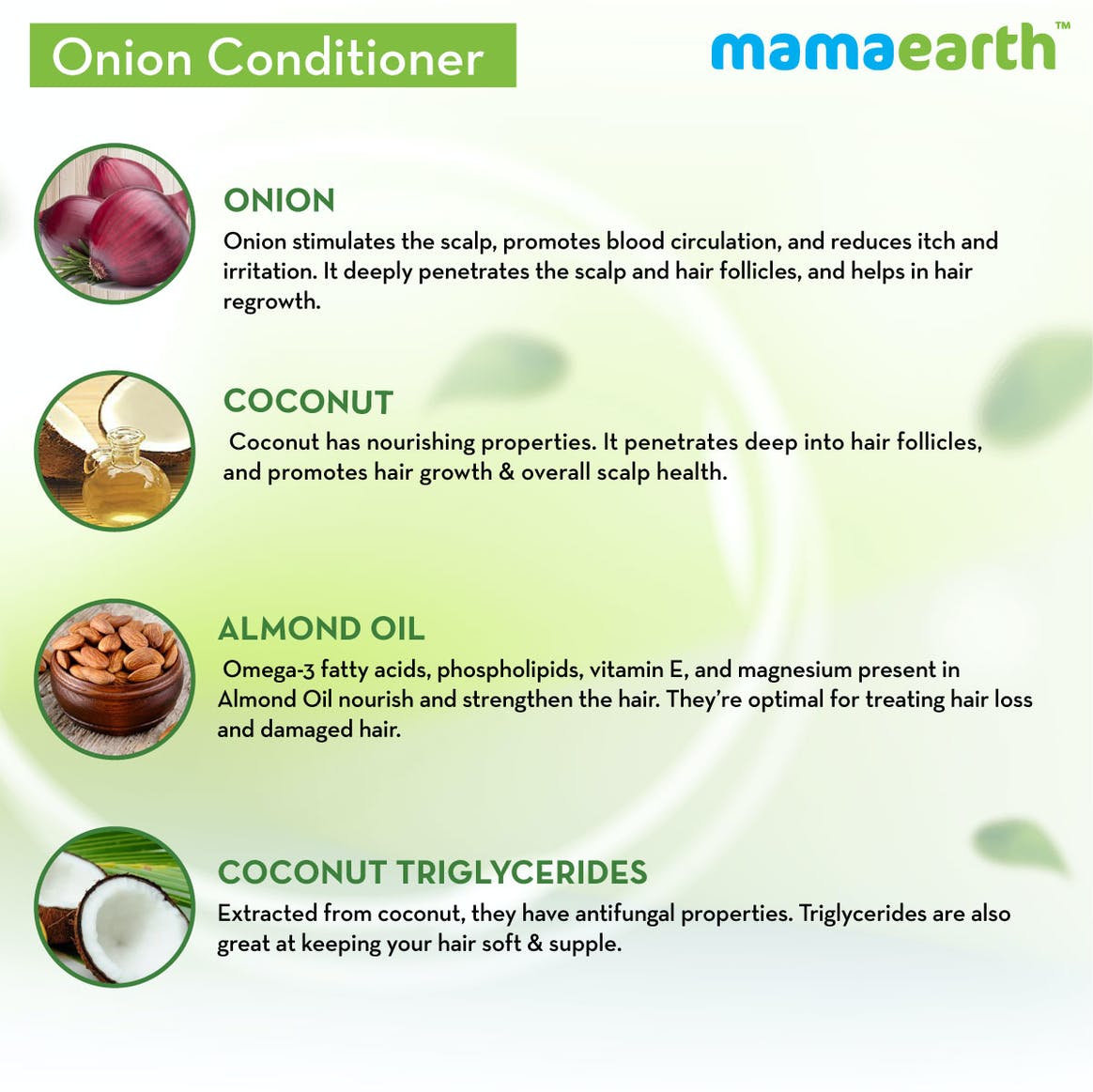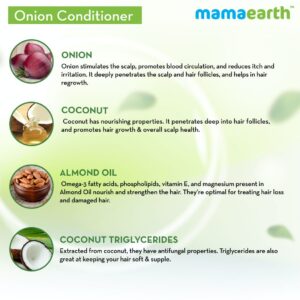 Stress, pollution & unhealthy lifestyle choices can lead to many hair problems, hair fall being the most common one. Mamaearth’s Onion Hair Conditioner helps you combat that. Onion, rich in Sulphur, Potassium & antioxidants, reduces hair fall & accelerates hair growth. Coconut has nourishing properties. It penetrates deep into the follicles and promotes hair growth & scalp health. Safe for coloured & chemically treated hair, this Conditioner is free of harmful chemicals & toxins such as Sulfates, Silicones, Parabens, Mineral Oil & Dyes.