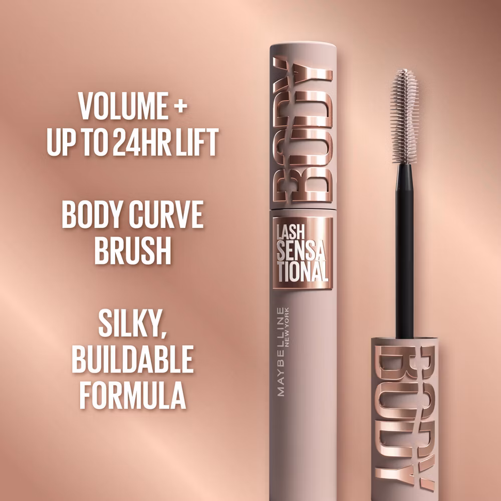 Experience Full Body lashes with Maybelline Lash Sensational Body Mascara. Our unique Body Curve Brush, designed with a double helix bristle pattern, stretches lashes from root to tip for a sensational lifted lash curve and sleek separation. The Silky Buildable formula wraps each lash smoothly and weightlessly builds full-body volume with sensational lift that lasts for up to 24HR. Forget touch-ups and flaking – Lash Sensational Body Mascara is smudge-proof, flake-proof, transfer-proof, clump-resistant and sweat-resistant. Available in three washable shades and one waterproof shade to perfectly complement your look. 93% of users agree their lashes look lifted, and 91% agree they feel lightweight all day.