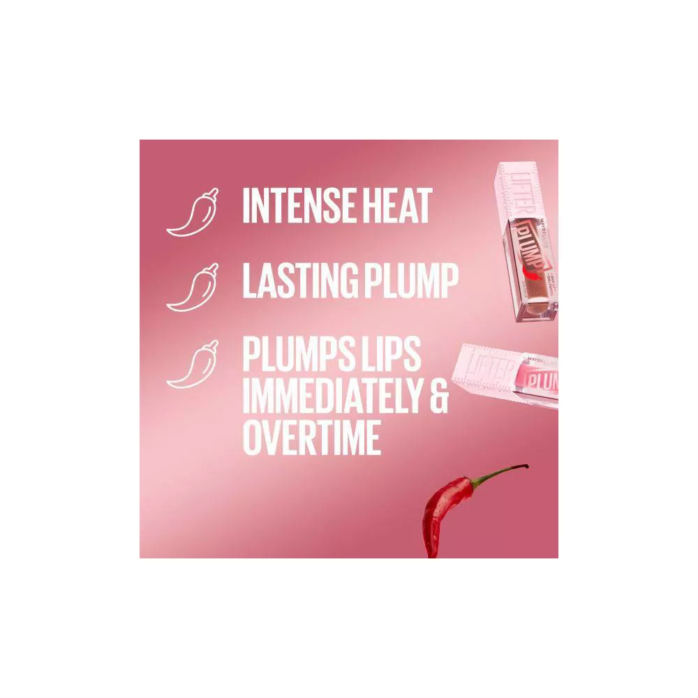 Glitter Lip Gloss with Chili Pepper and 5% Maxi-Lip: Maybelline Lifter Gloss Plump delivers a plumped-looking lip makeup look in a New York minute; this lip plumper gloss is formulated with chili pepper and Maxi-Lip to instantly plump lips and smooth lip lines